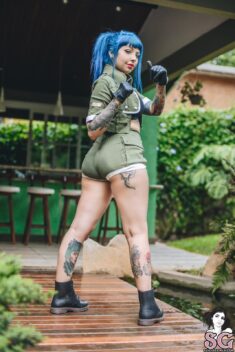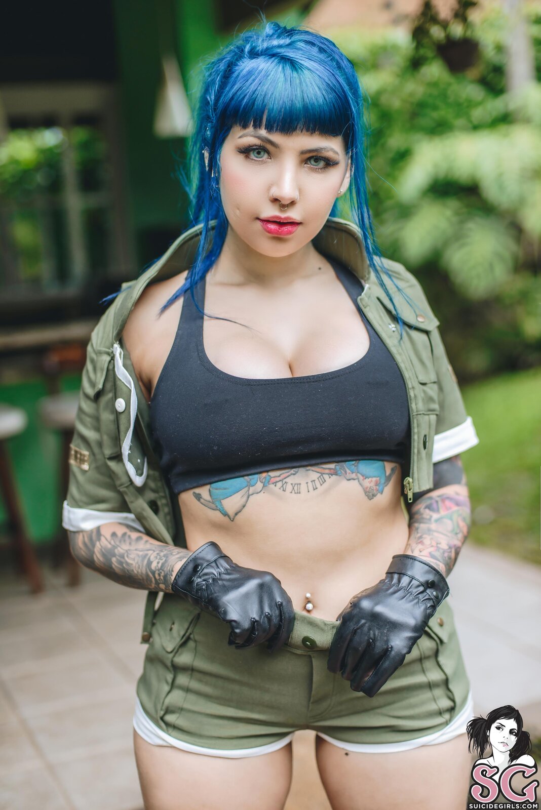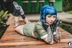 Busty blue haired girl Fla flaunts her sexy ass and tattoos outdoors