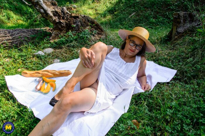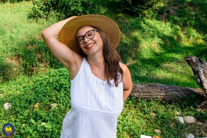 Hairy mature woman Busty Tina loves to get wet outside in the grass